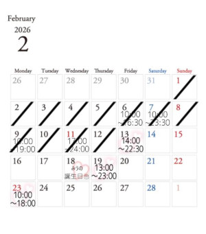 | 02/21(土) | 02/22(日) | 02/23(月) | 02/24(火) | 02/25(水) | 02/26(木) | 02/27(金) |